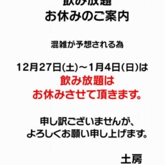 【土房】年末年始 飲み放題休止のお知らせ