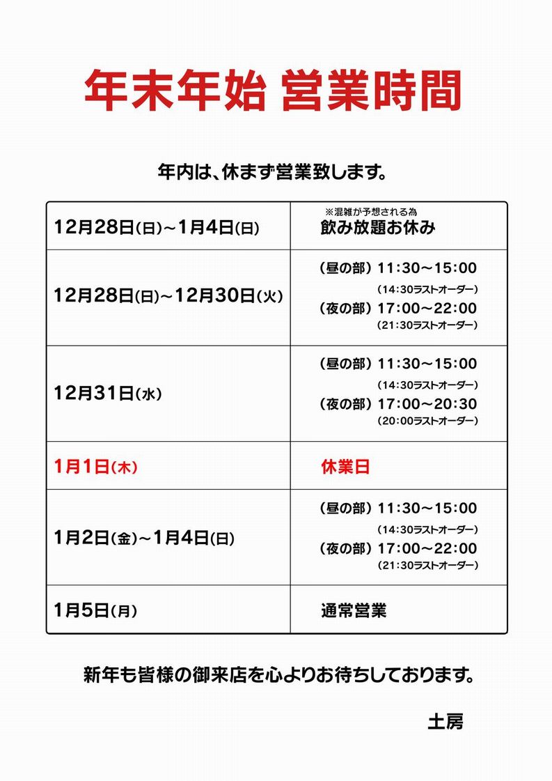 【土房】年末年始 飲み放題休止のお知...