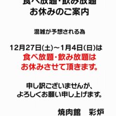 【彩炉】食べ放題・飲み放題お休みのご案内